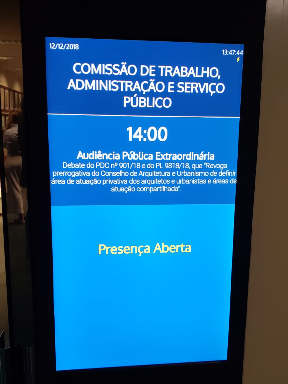 Nesta quarta, 12/12/2018, o presidente do CAU/MA, Marcelo Rodrigues e os conselheiros federais do CAU/MA (titular e suplente), Emerson do Nascimento e Lourival Coelho participaram do debate do PDC nº 901/18 e do PL 9818/18, que “Revoga prerrogativa do Conselho de Arquitetura e Urbanismo de definir área de atuação privativa dos arquitetos e urbanistas e áreas de atuação compartilhada” na Câmara dos Deputados em Brasília -DF. A audiência pública extraordinária conta com a participação do CAU/BR, IAB, FNA e demais entidades nacionais de arquitetos e urbanistas para defender as normas vigentes, mas é importante que o maior número possível de profissionais participem desse debate mandando comentários e perguntas . É fundamental defendermos as prerrogativas de autorregulação profissional estabelecidas pela Lei 12.378/2010 sobre dois projetos de lei que ameaçam as atribuições privativas de arquitetos e urbanistas.