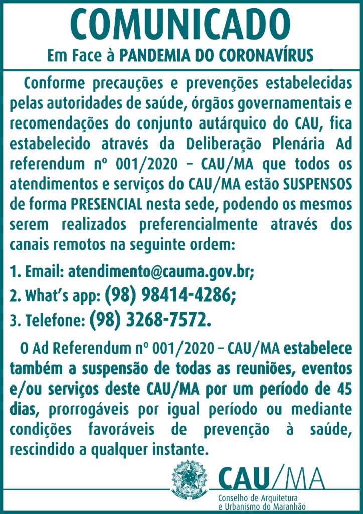 Conforme precauções e prevenções estabelecidas pelas autoridades de saúde, órgãos governamentais e recomendações do conjunto autárquico do CAU, fica estabelecido através da Deliberação Plenária Ad Referendum nº 001/2020 – CAU/MA que todos os atendimentos e serviços do CAU/MA estão SUSPENSOS de forma PRESENCIAL nesta sede, podendo os mesmos serem realizados preferencialmente através dos canais remotos na seguinte ordem: