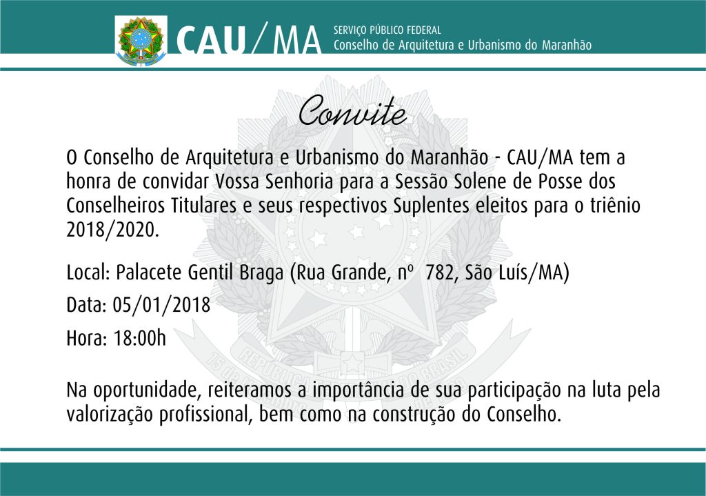 A Solenidade de Posse dos novos Conselheiros do CAU/MA e seus respectivos Suplentes acontecerá amanhã, 05/01, às 18h, no Palacete Gentil Braga (Rua do Passeio, Centro, São Luís/MA).