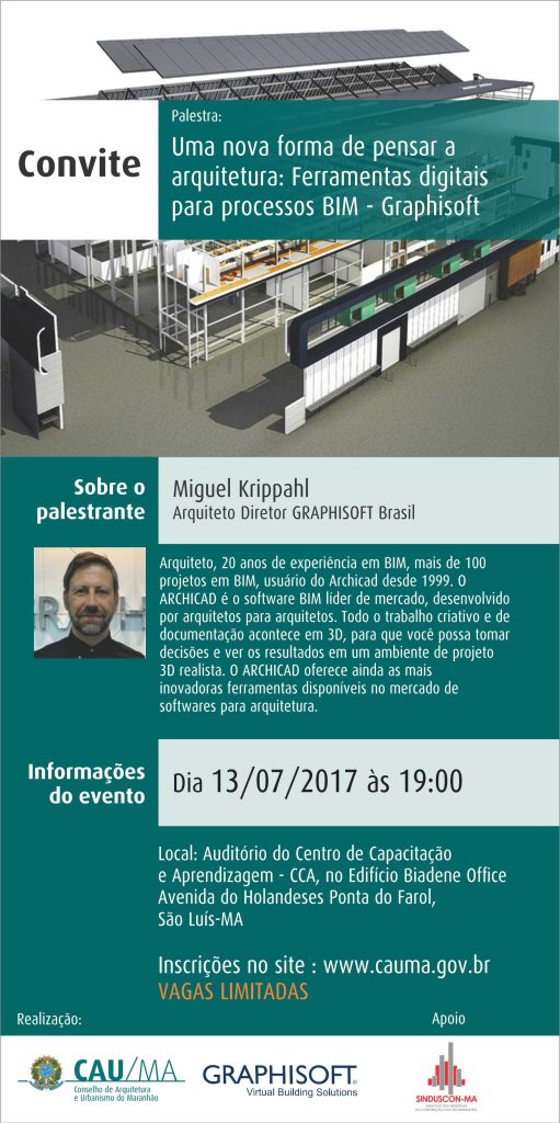 O Conselho de Arquitetura e Urbanismo do Maranhão – CAU/MA, em parceria com a Graphisoft realiza no dia 13/07, às 19h, no Centro de Capacitação e Aprendizagem – CCA – Edíficio Biadene, a palestra “Uma nova forma de pensar a arquitetura: Ferramentas Digitais para processos BIM”.   A GRAPHISOFT Brasil, representado por Miguel Krippahl que é usuário do ARCHICAD desde 1999,  fará uma apresentação do ARCHICAD 21 e o BIMx aos Arquitetos e Urbanistas Maranhenses.  As inscrições estão abertas em nosso site, mediante preenchimento de formulário. Faça a sua, pois as inscrições são limitadas.