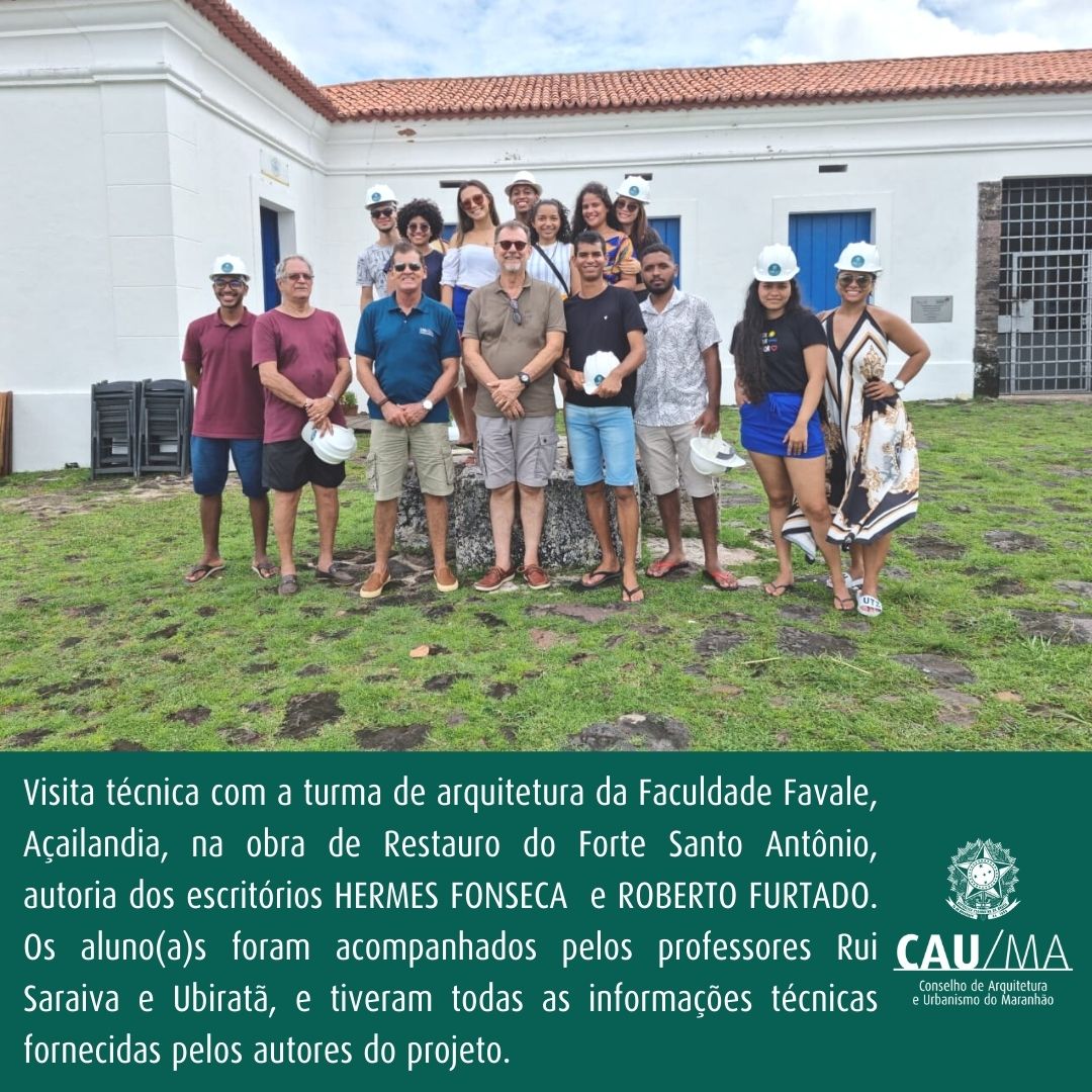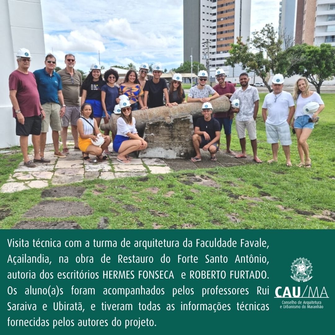 Estudantes de Arquitetura e Urbanismo da Faculdade Favale, Açailandia, realizaram visita técnica na obra de Restauro do Forte Santo Antônio, autoria dos escritórios HERMES FONSECA e ROBERTO FURTADO. Os aluno(a)s foram acompanhados pelos professores Rui Saraiva e Ubiratã, e tiveram todas as informações técnicas fornecidas pelos autores do projeto, atualmente também presidente e conselheiros do CAU/MA.