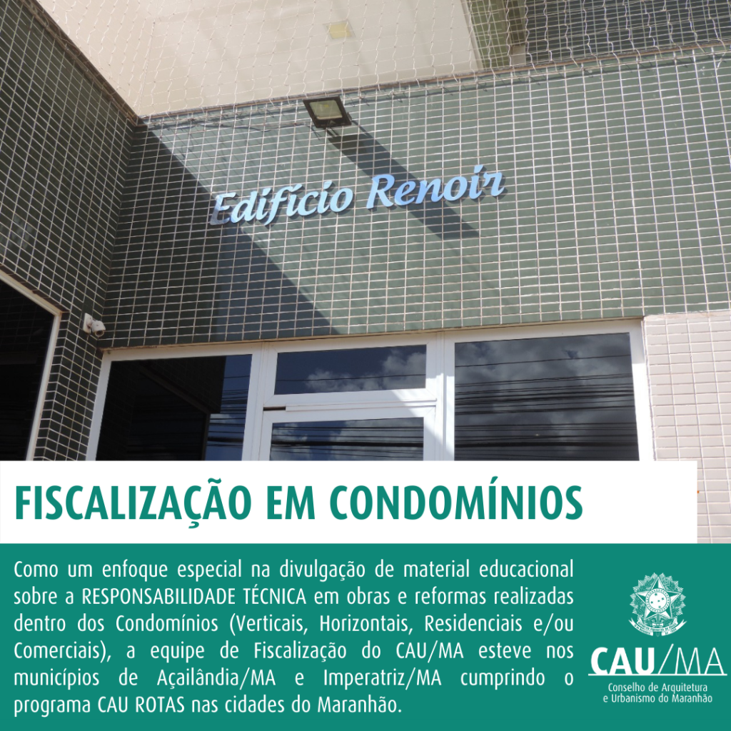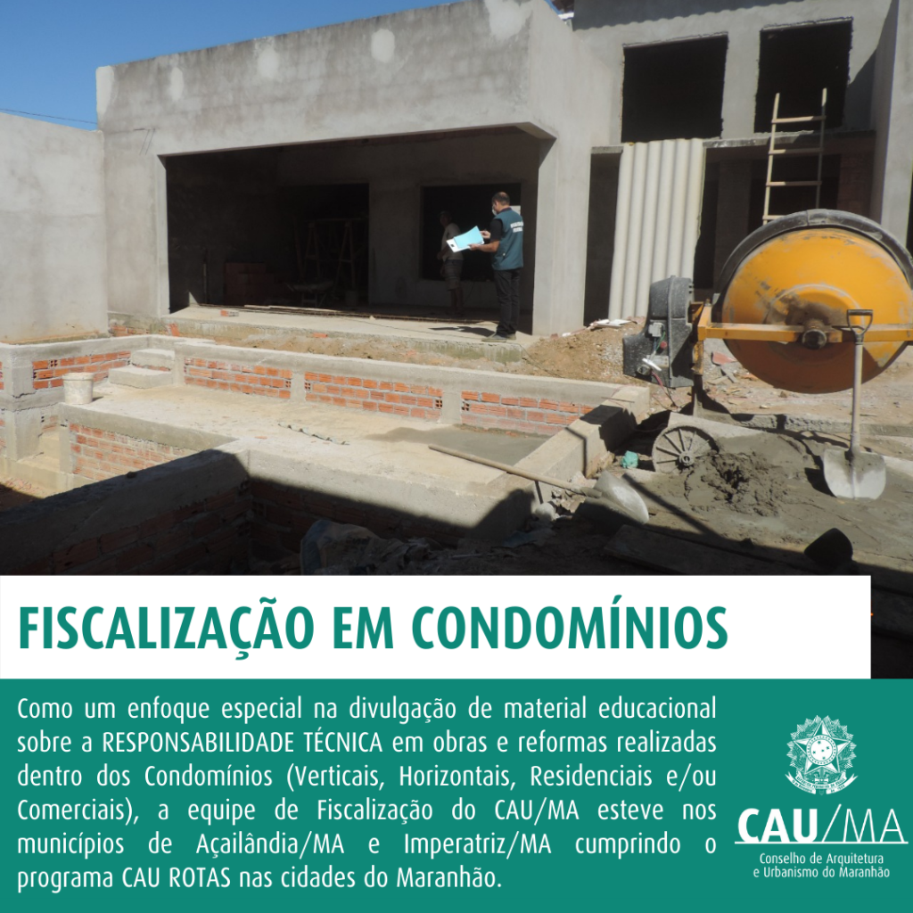 Como um enfoque especial na divulgação de material educacional sobre a RESPONSABILIDADE TÉCNICA em obras e reformas realizadas dentro dos Condomínios (Verticais, Horizontais, Residenciais e/ou Comerciais), a equipe de Fiscalização do CAU/MA esteve nos municípios de Açailândia/MA e Imperatriz/MA cumprindo o programa CAU ROTAS nas cidades do Maranhão.