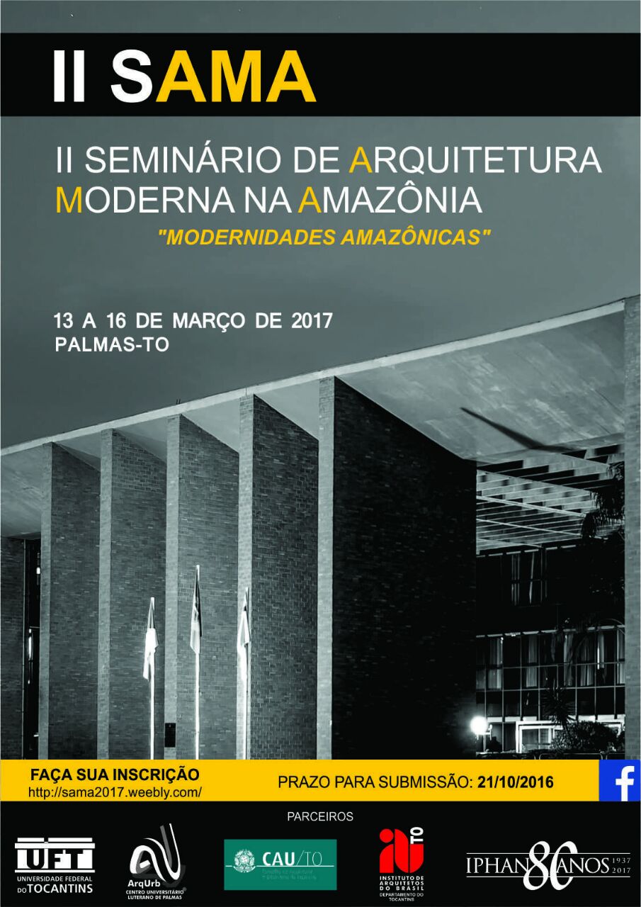 Já estão abertas as inscrições para o II Seminário de Arquitetura Moderna na Amazônia – II SAMA, que acontecerá em Palmas – TO, no período de 13 a 16 de março de 2017. O evento organizado pelos cursos de arquitetura e urbanismo da Universidade  Federal do Tocantins( UFT) e do Centro Universitário Luterano de Palmas (CEULP), com a parceria do Consleho de Arquitetura e Urbanismo do Tocantins (CAU/TO). As inscrições podem ser realizadas através do link  http://sama2017.weebly.com/.