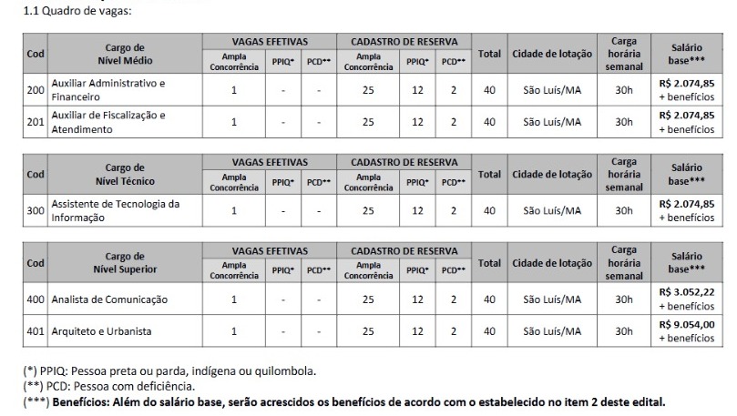 Estão abertas as inscrições para o Concurso Público para provimento de vaga e formação de cadastro de reserva em cargos de nível médio, técnico e superior do Conselho de Arquitetura e Urbanismo do Maranhão – CAU/MA. Os candidatos aprovados serão submetidos ao regime de trabalho da Consolidação das Leis do Trabalho (CLT), e farão jus aos direitos, às vantagens e às obrigações previstas em lei, reguladas em acordo coletivo de trabalho e em normas administrativas internas do CAU/MA.