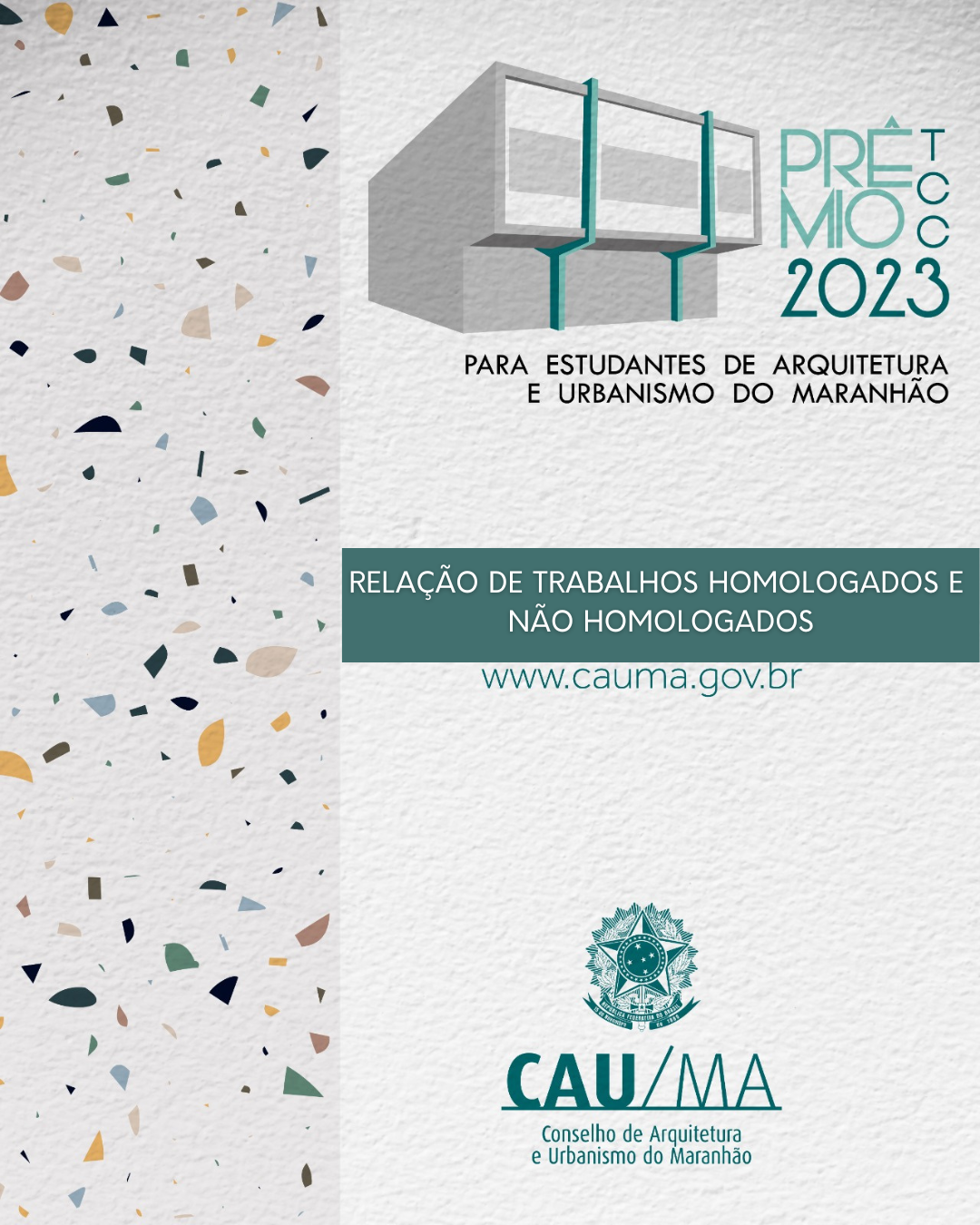 O CAU/MA por meio da Comissão de Ensino e Formação – CEF – CAU/MA torna público a listagem dos trabalhos homologados e não-homologados do Prêmio TCC CAU/MA 2023. A homologação dos trabalhos está condicionada ao cumprimento dos termos do Edital CEF-CAU/MA nº 01/2023, referente à Premiação dos Trabalhos de Conclusão de Curso do CAU/MA – Prêmio TCC/2022, aprovado pela Deliberação Plenária DPOMA nº 002-08/2023 de 01 de agosto de 2023, e avaliados pela Comissão de Ensino e Formação do CAU/MA.